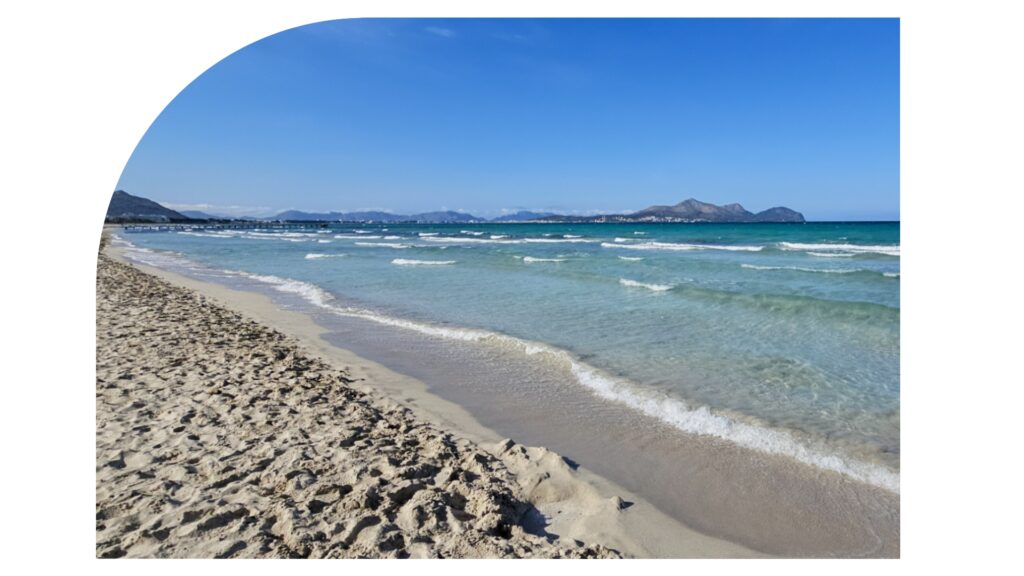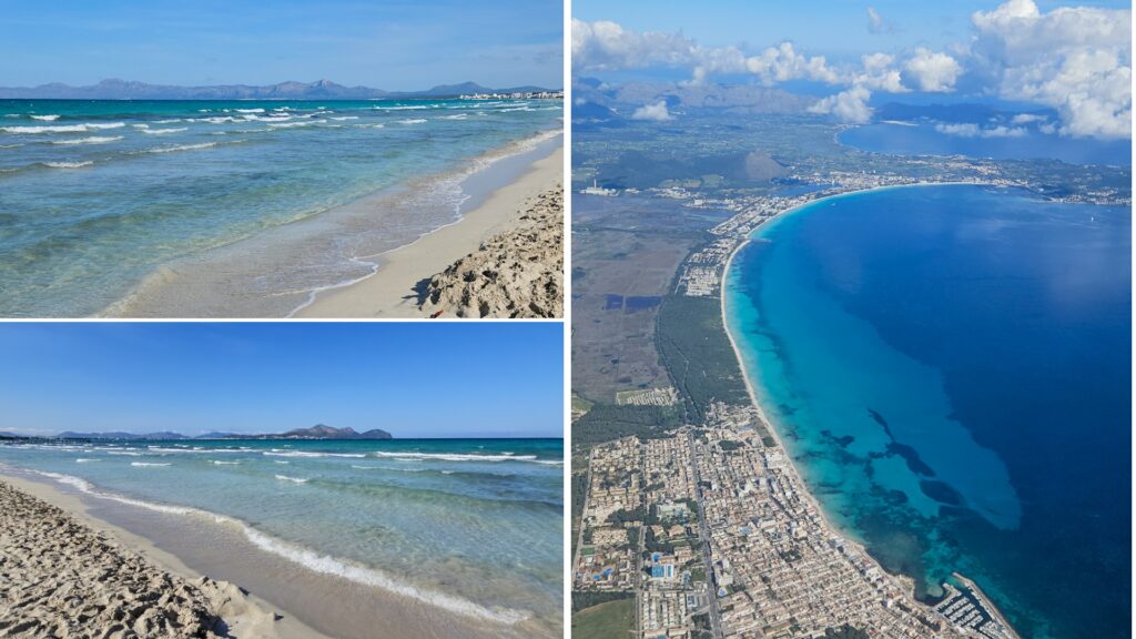 🏖️ Platja de Muro fut la première plage que nous avons aperçue depuis l’avion, avec sa longue bande de sable doré bordée d’une mer turquoise. En la découvrant ensuite sur place, nous avons retrouvé cette impression d’immensité : la plage s’étire sur près de 6 kilomètres, entre Alcúdia et Can Picafort.