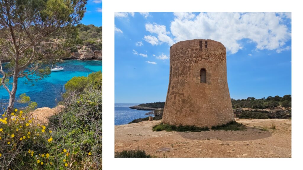 Depuis la plage, il vaut mieux poursuivre un peu à pied en direction de la tour que l’on aperçoit au loin. Le chemin est agréable et offre de beaux points de vue sur la crique et la mer. C’est une jolie balade, simple et tranquille, pour apprécier Cala Pi autrement.