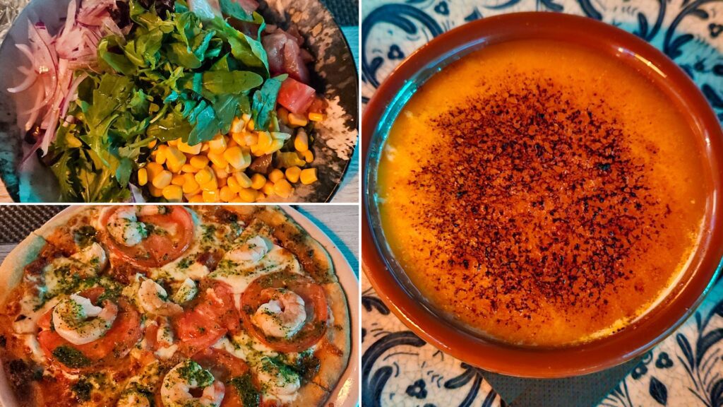 Nous y avons très bien mangé : de la salade fraîche et généreuse à la pizza savoureuse, sans oublier une crème brûlée délicieuse pour terminer sur une note sucrée. Le tout servi avec le sourire, dans une atmosphère agréable.