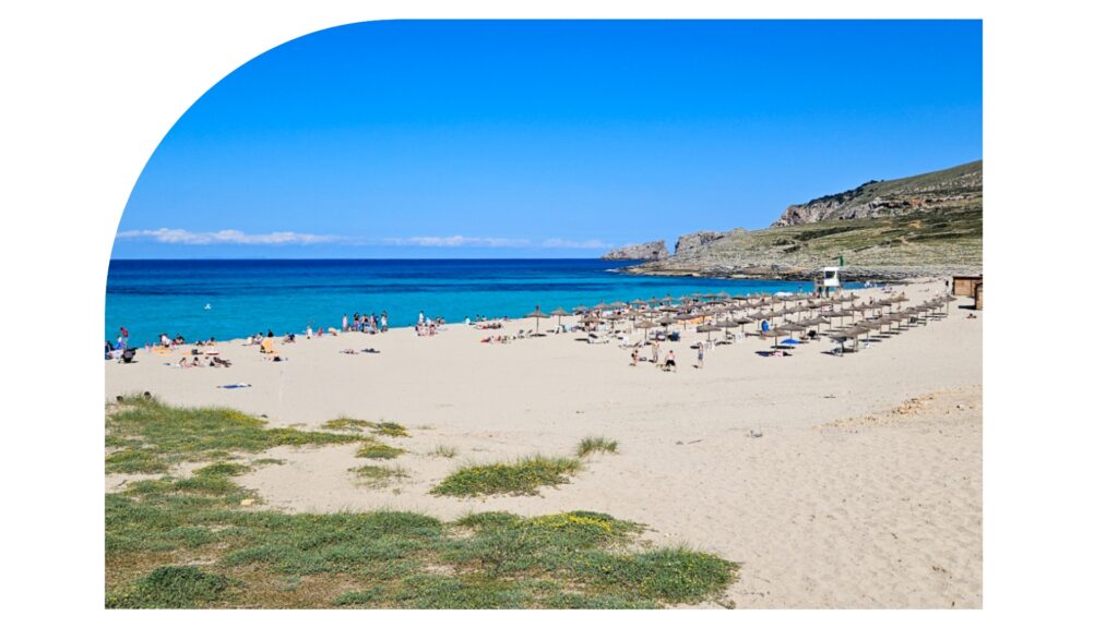 ⚓ À quelques minutes seulement de Cala Romàntica, Cala Mendia offre une atmosphère un peu plus calme, tout en gardant le même charme : une belle plage de sable fin, une eau turquoise et limpide, et des falaises claires en toile de fond.