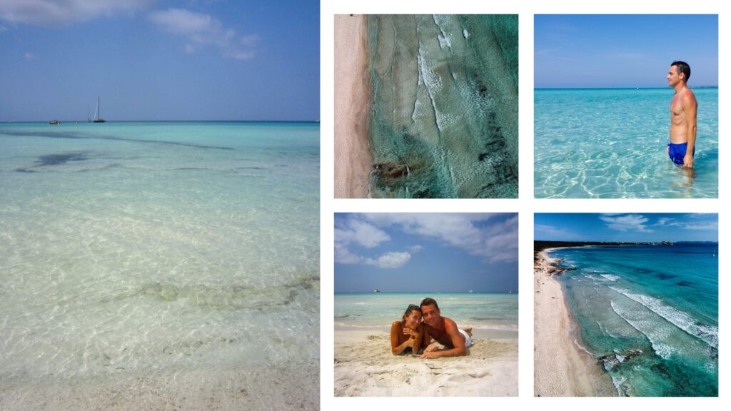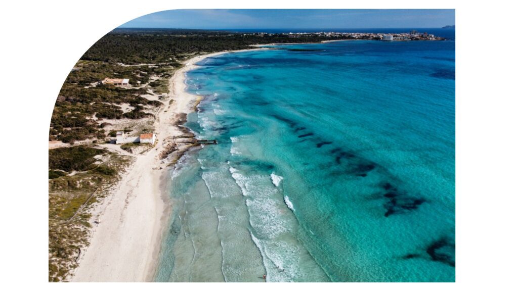 La plage s’étire sur plusieurs kilomètres, formée de différentes zones plus ou moins animées. Certaines parties sont aménagées, avec transats et petits bars de plage, tandis que d’autres restent encore totalement sauvages, bordées de dunes et de pins. C’est cette alternance qui donne tout son charme à Es Trenc.
