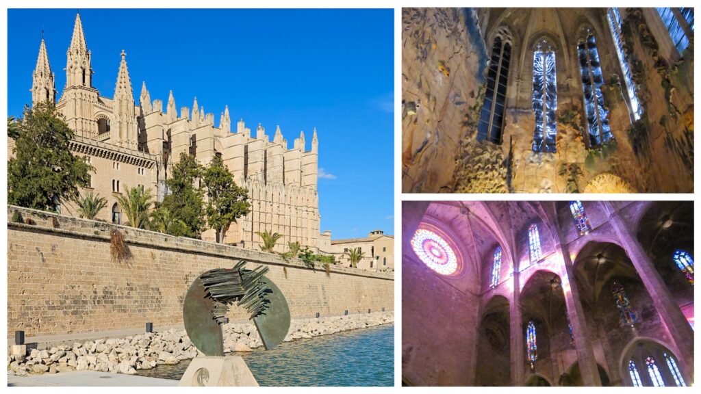 C’est la première chose que l’on aperçoit en arrivant à Palma par la mer : la majestueuse cathédrale La Seu domine la baie et semble flotter au-dessus des remparts. Sa silhouette gothique, élancée et lumineuse, est tout simplement impressionnante. C’est d’ailleurs la première visite que nous avons faite en arrivant à Palma, comme un passage obligé pour vraiment entrer dans la ville. Construite à partir du début du XIVᵉ siècle sur l’emplacement d’une ancienne mosquée, La Seu est considérée comme l’une des plus belles réalisations du gothique final. Sa façade principale, reconstruite au XIXᵉ siècle après un séisme, mêle élégance néo-gothique et détails Renaissance, tandis que le portail du Mirador, tourné vers la mer, dévoile une fine décoration du XVe siècle. Lors de notre dernier séjour, nous avons choisi de l’admirer depuis l’extérieur, au fil d’une promenade le long du lac et des jardins, mais nous nous souvenons encore de la lumière incroyable qui baigne l’intérieur. La grande rosace, de plus de onze mètres de diamètre, inonde la nef d’une clarté colorée et presque mystique. La taille de l’édifice est impressionnante : 121 mètres de long, 55 mètres de large et 44 mètres de haut sous la voûte centrale ! Les quatorze piliers octogonaux qui soutiennent l’ensemble donnent une impression de légèreté saisissante. En tant que passionnés des œuvres de Gaudí, nous avions été fascinés par son baldachin en fer forgé suspendu au-dessus du maître-autel — une création audacieuse et poétique réalisée en 1912. Dans la chapelle de Saint-Pierre, nous avions également découvert la surprenante œuvre contemporaine de Miquel Barceló, inspirée de la parabole de la multiplication des pains et des poissons, avec ses reliefs d’argile aux tons marins. À chaque visite, La Seu nous émerveille un peu plus : c’est une cathédrale vivante, à la fois ancrée dans l’histoire et ouverte à la modernité.