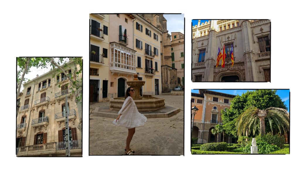 Découvrir le centre historique est un vrai plaisir pour les yeux et un voyage à travers les époques. Nous avons adoré flâner dans le Casco Antiguo, un labyrinthe de ruelles pavées bordées de façades colorées, de patios cachés et de palais anciens aux volets verts typiquement majorquins. Chaque détour offre une nouvelle perspective ou une belle photo à capturer : un balcon en fer forgé, une porte sculptée, un jeu d’ombres sur les murs ocre. Le cœur du quartier s’articule autour de la Plaça Major, pleine de vie, et de la Plaça de Cort, célèbre pour son immense olivier millénaire devant la mairie — un spot photo incontournable. À proximité, les élégantes Plaça Mercat et Passeig del Born invitent à la promenade entre boutiques et bâtiments modernistes, comme le Gran Hotel, chef-d’œuvre d’architecture du début du XXᵉ siècle.
