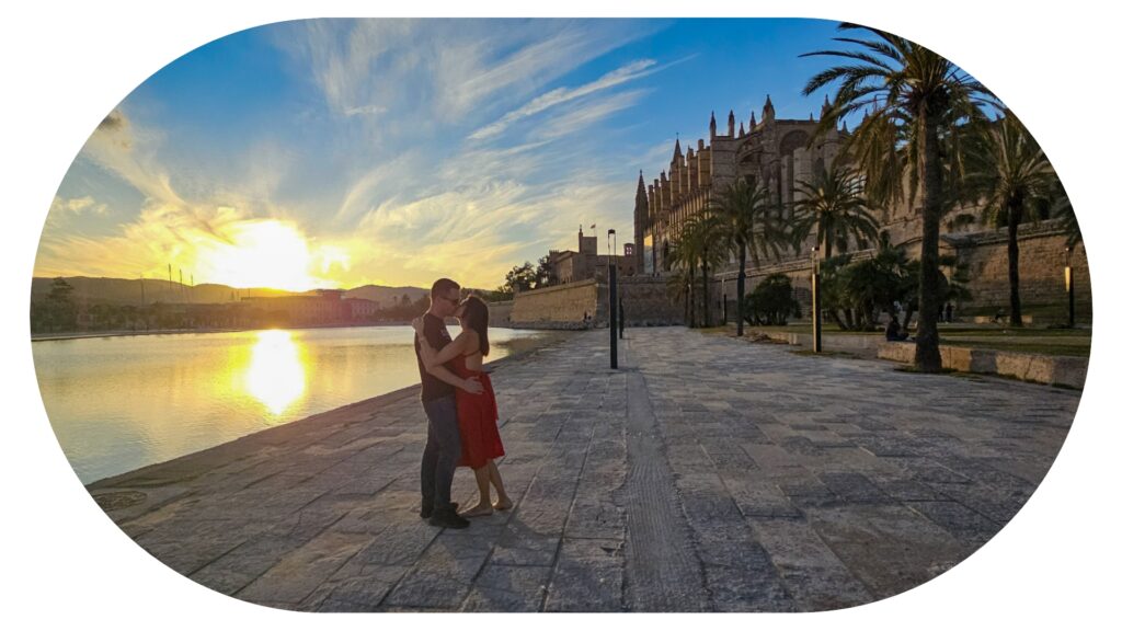 Et puis, juste en contrebas des remparts, il y a le Parc de la Mar, un endroit que nous aimons particulièrement. C’est là que nous faisons souvent nos pauses, quel que soit le moment de la journée : le matin, quand la ville s’éveille doucement, ou en fin d’après-midi, quand les reflets du soleil jouent sur l’eau du grand bassin artificiel. Le lieu est paisible, avec une vue imprenable sur la cathédrale et la mer. À l’heure du sunset, le décor devient magique : les tons dorés se mêlent au bleu du ciel, et l’ambiance est à la fois calme et photogénique. C’est, sans hésiter, l’un de nos spots préférés de Palma. Le dimanche, le parc s’anime souvent de petits marchés ou de concerts en plein air, parfaits pour prolonger la promenade dans une atmosphère détendue et conviviale.
