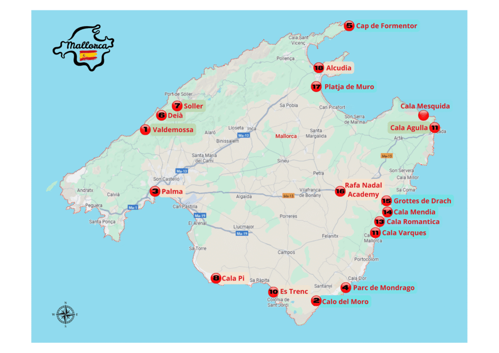 Réveil matinal pour ce troisième jour afin de profiter pleinement de Calo del Moro💙(2), l’une des plus belles criques de Majorque. En arrivant tôt, on savoure la tranquillité du lieu avant l’afflux de visiteurs et on profite d’une baignade dans ses eaux cristallines entourées de falaises sauvages. Après ce moment de pure beauté, retour à l’Universal Hotel Marqués pour un petit-déjeuner bien mérité face à la mer. La journée se poursuit ensuite vers le nord-est, avec un arrêt à la Rafa Nadal Academy (16) à Manacor, pour découvrir le complexe dédié au champion majorquin. À proximité, plusieurs plages magnifiques comme Cala Romàntica (13) et Platja de Cala Mendia (14) invitent à la détente et à la baignade. Vers midi, cap sur les célèbres Grottes du Drach (15), à Porto Cristo, pour une visite impressionnante du réseau souterrain et de son lac intérieur illuminé. Sur le chemin du retour, halte nature avec un stop à Cala Varques puis au Parc naturel de Mondragó💙(4), un véritable havre de paix entre pinèdes, criques turquoise et sentiers côtiers. En fin de journée, retour à l’hôtel pour se détendre et dîner sur place, profitant une nouvelle fois de la vue apaisante sur la mer au coucher du soleil.